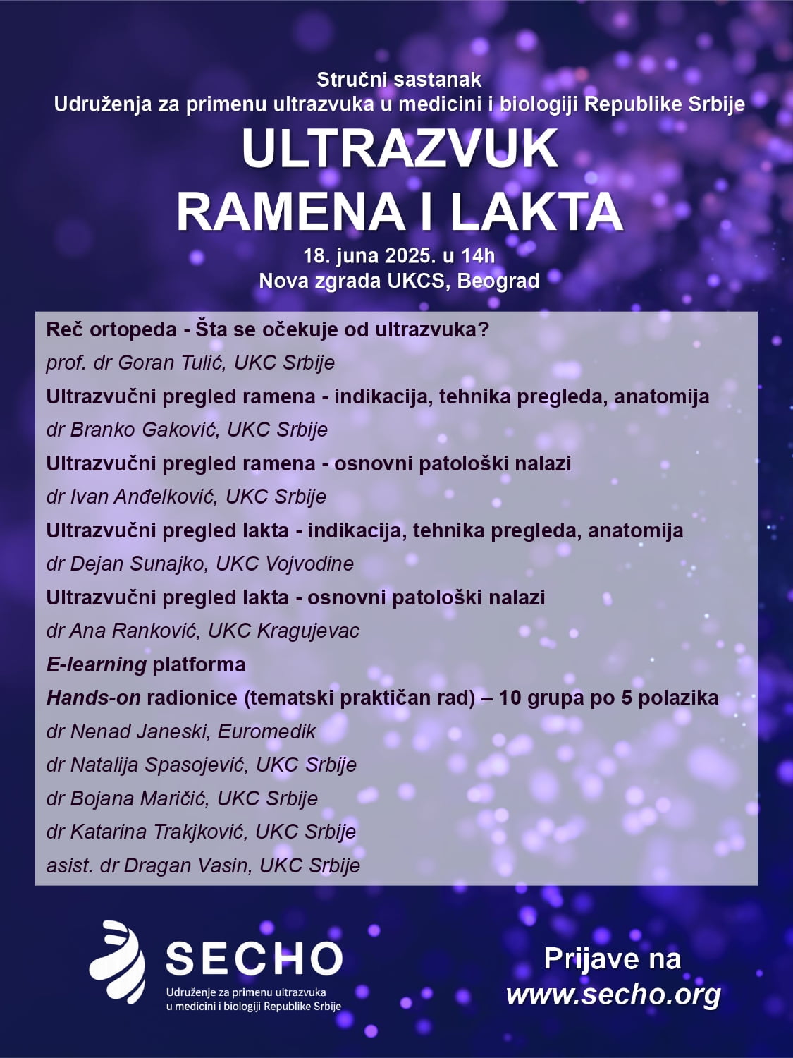 Stručni sastanak SECHO predstavlja jednodnevnu edukaciju koja je namenjena svima koji se žele upoznati sa mogućnostima ultrazvučnog pregleda muskuloskeletnog sistema. Tokom radionice, polaznici će naučiti da prepoznaju različite anatomske strukture ramena i lakta, kao i da nauče više o primeni ultrazvuka u svakodnevnoj praksi.